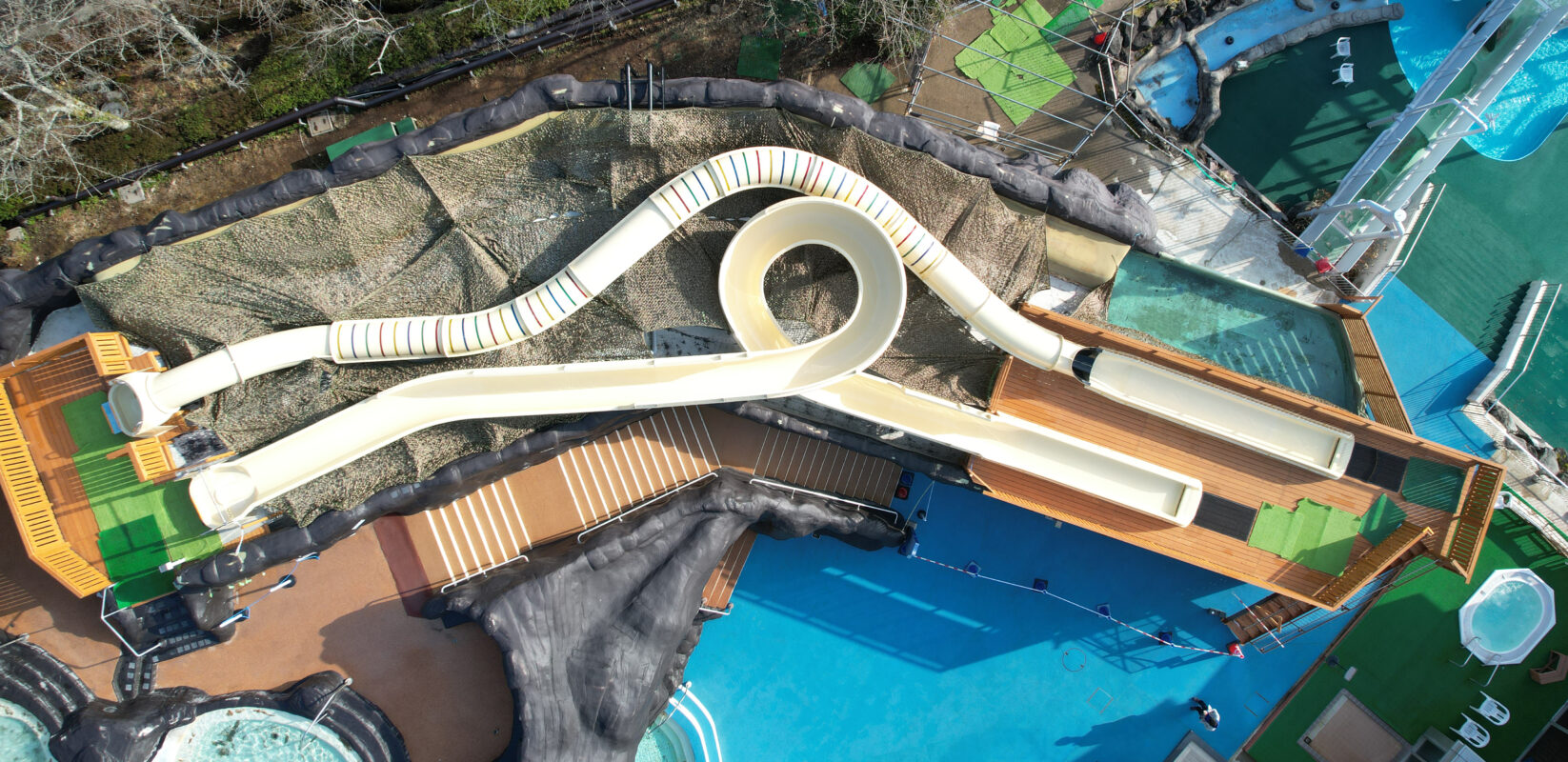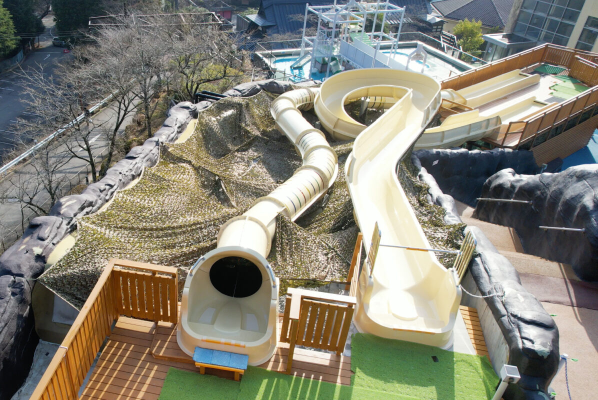 全長65m高さ10mのビッグなウォータースライダー。 スライダー本体はFRP製 長崎 ハウステンボス 長崎 ハウステンボス 全長約34m自然透過型特殊効果演出のウォータースライダー 箱根ユネッサン 虹スライダー 箱根ユネッサン 虹スライダー 箱根ユネッサン 虹スライダー